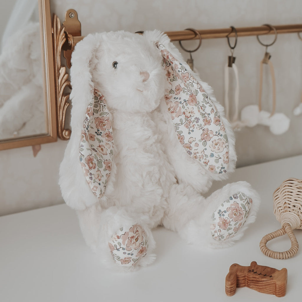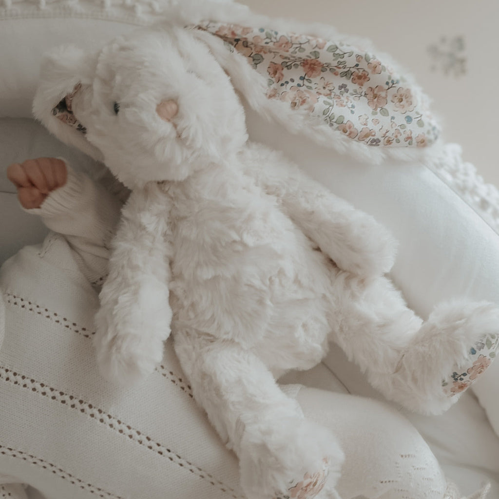 Looking for some bunny to love? Faith Bunny Plush Toy exudes loads of charm with her long floppy ears, cute button nose and French-inspired floral print. Crafted of the plushest cream faux fur, this heirloom bunny stuffed animal is the perfect present for Easter or any day of the year. Oversized and oh-so-snuggly, Mon Ami's one-of-a-kind bunny plush toy is ready to hop from naptime to playtime to bedtime. Our beautiful bunny brings an elevated touch to any stuffed animal collection.
